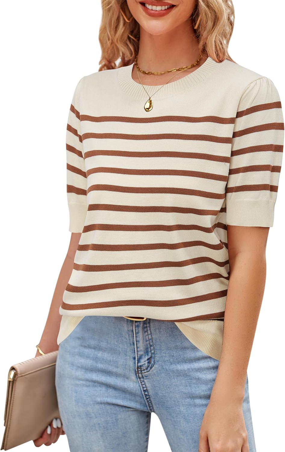 Newshows Womens Summer Short Sleeve Sweater Tops Fall Business Casual Outfits Crewneck Lightweight Dressy Knit Shirts