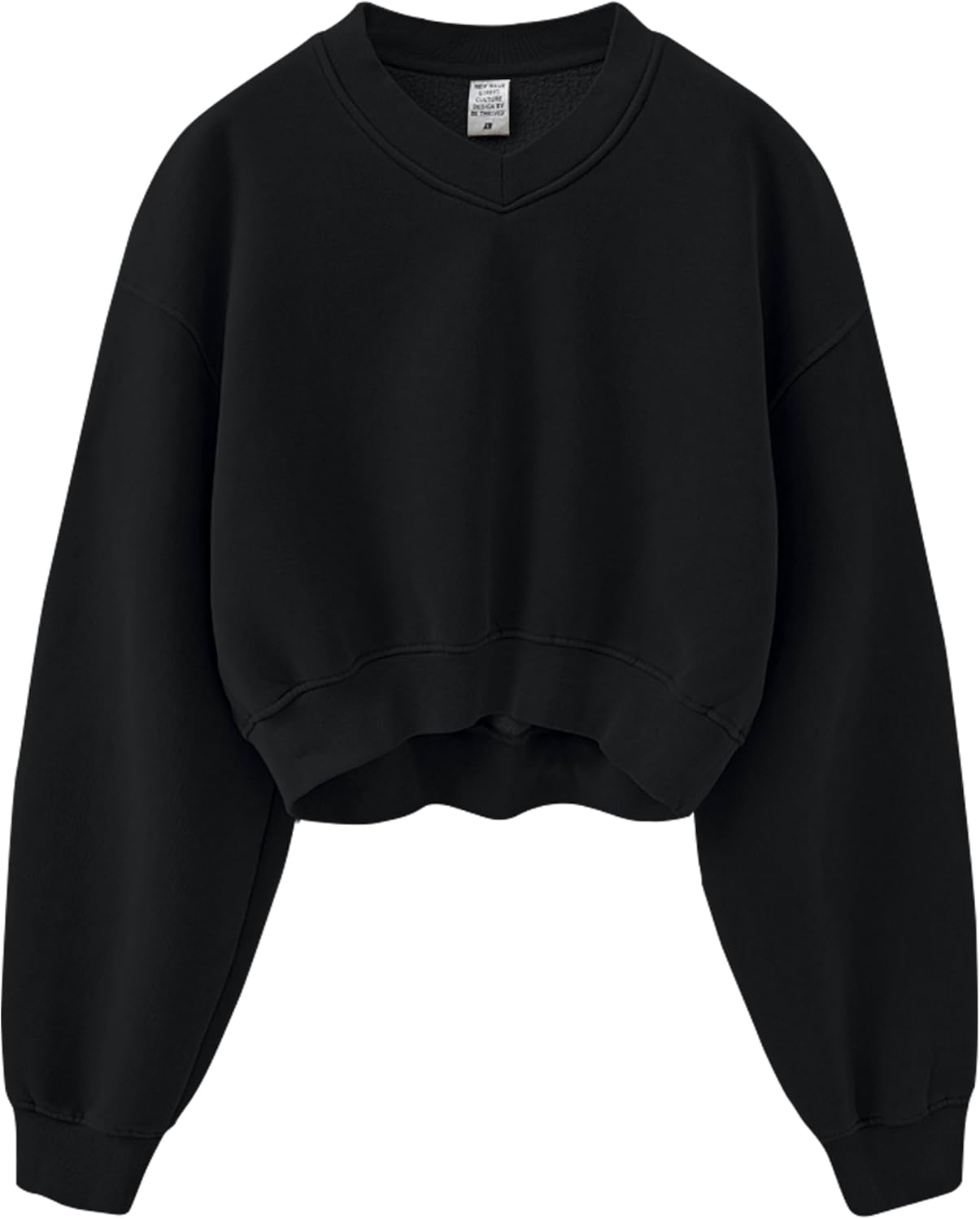 Meladyan Women Casual Cropped Sweatshirt Basic Solid Long Sleeve Fleece V Neck Loose Drop Shoulder Pullover Crop Tops Vintage