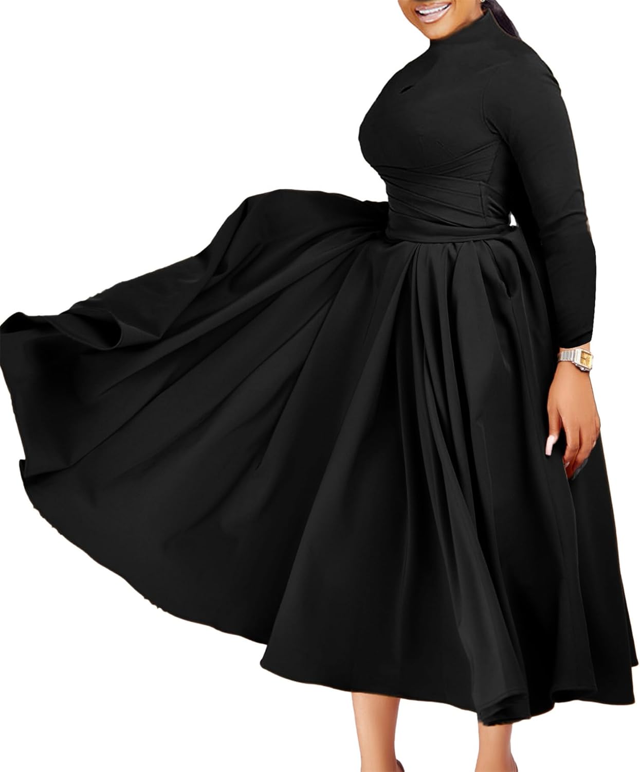 Women's Long Sleeve Maxi Dress High Waist Ruched A Line Swing Cocktail Party Dresses Plus Size