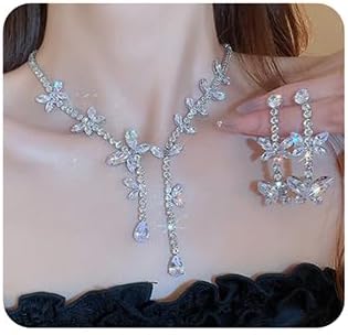 Wiwpar 2PCS Crystal Rhinestone Butterfly Bridal Wedding Necklace Earrings Set Silver Bow Butterfly Pendent Collar Tassel Chain Choker Necklace and Earrings Set for Party Costume Dressy Accessory