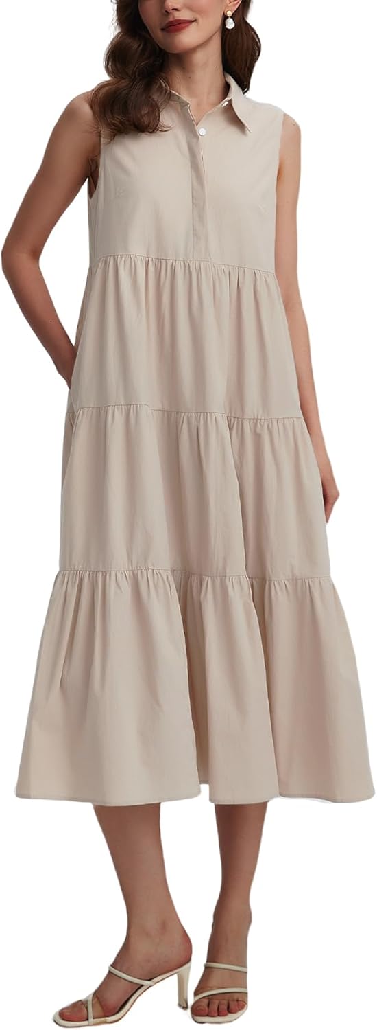 Womens Summer Button Down Maxi Shirt Dress Sleeveless Collared V Neck Tiered Flowy Midi Dress