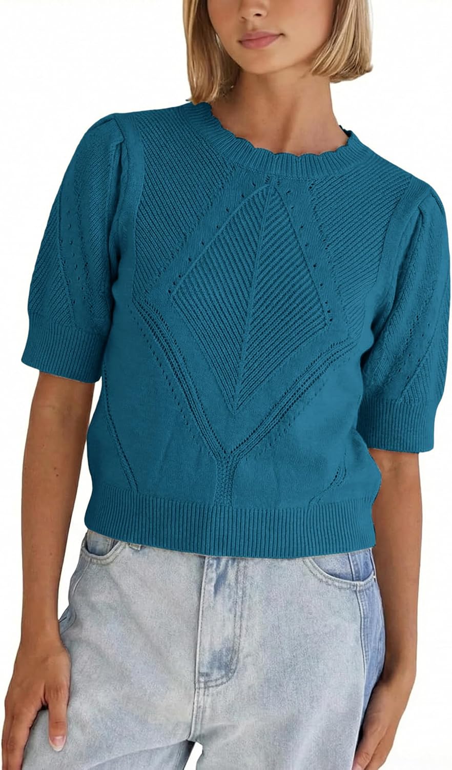 SCUSTY Women's Short Sleeve Knit Sweater Puff Sleeve Crew Neck Cropped Lightweight Knit Pullover Top Tee
