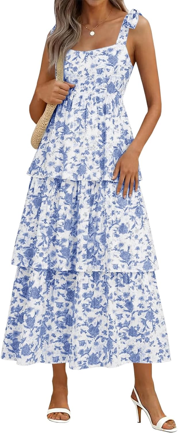 Wenrine Womens Summer Floral Maxi Dress Casual Tie Strap Sleeveless Ruffle Tiered Smocked Loose Boho Beach Dresses