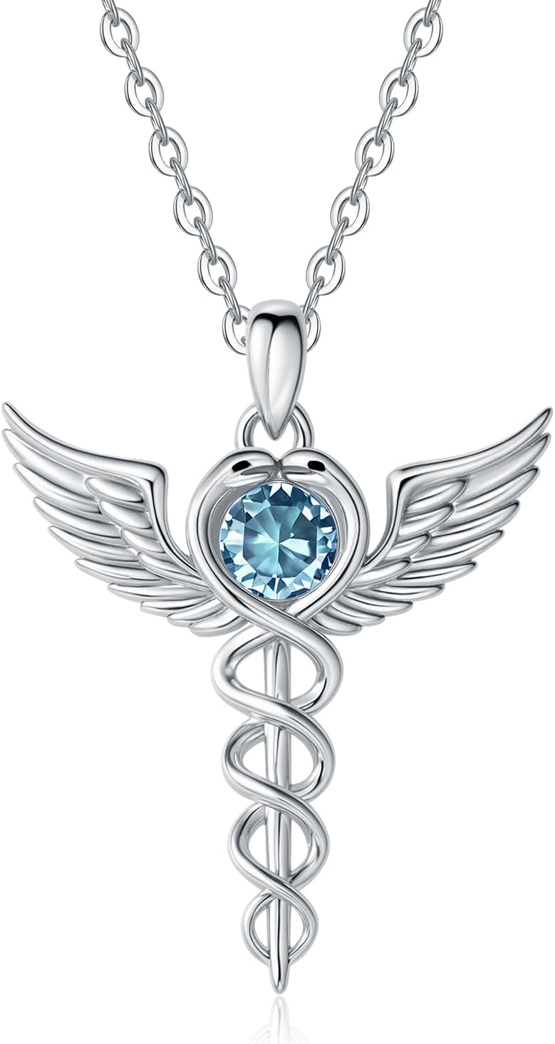 Caduceus Necklace Sterling Silver Angle Wings Snake Birthstone Pendant Nursing Theme Jewelry Birthday Gifts for Women