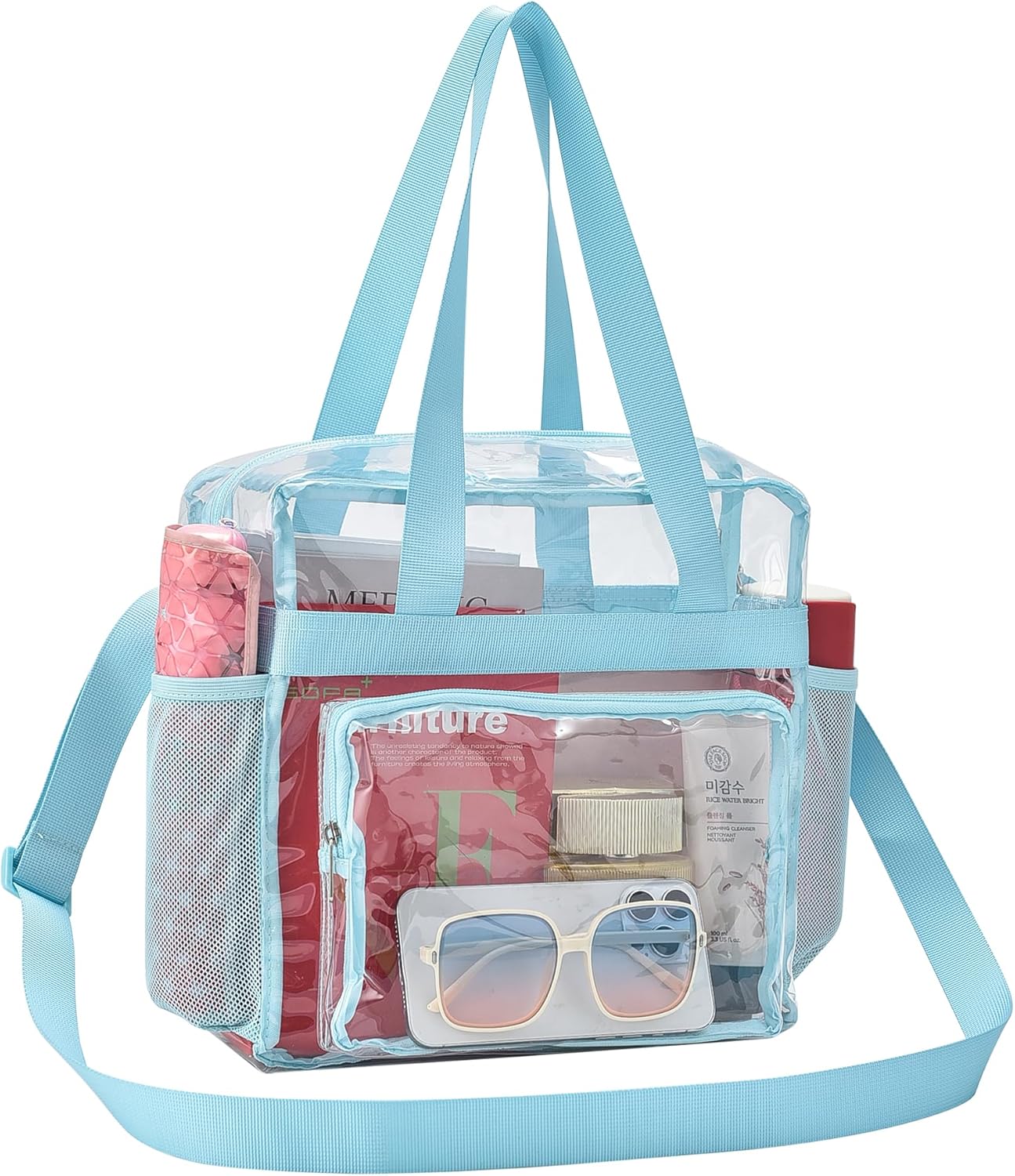 - Large Capacity: The clear stadium gym tote bags offers 4 pockets.The main compartment is large enough to hold up your daily essencials, such as digital camera, suntan lotion, , keys, cell phone, hat, sunglasses and also fit a water bottle. The front pocket is suitable for tickets,slip, phone.The two side pockets is perfect for bottle water.