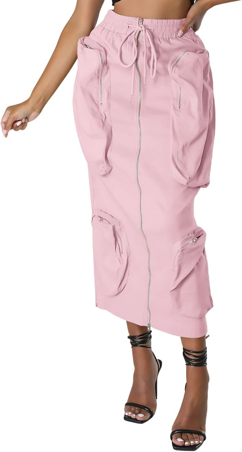 ebossy Women's Vintage 90s Drawstring Stretchy Zipper Muti-Pockets Pencil Long Cargo Skirt