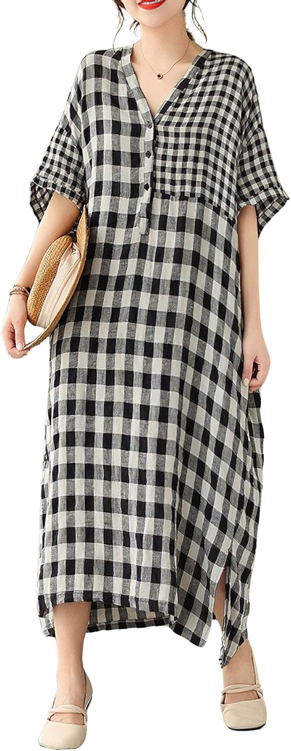 chouyatou Women's Summer Casual Loose Linen Dress Oversized Plaid Gingham Splicing Midi Cotton Dress