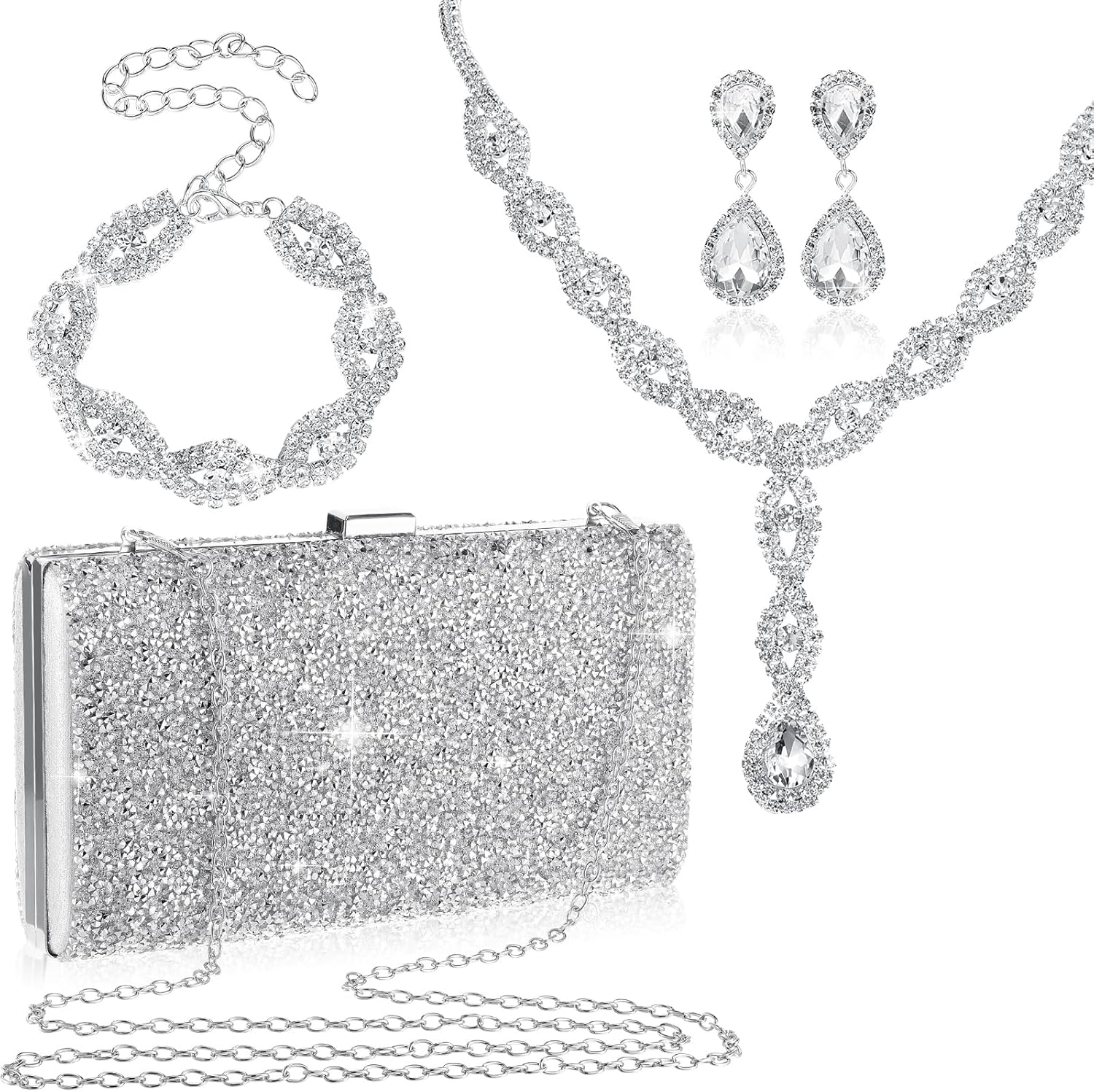 Mixweer 4 Pieces Clutch Purses Bag for Women Evening Rhinestone Jewelry Set Bling Necklace Earrings Bracelets Set for Wedding
