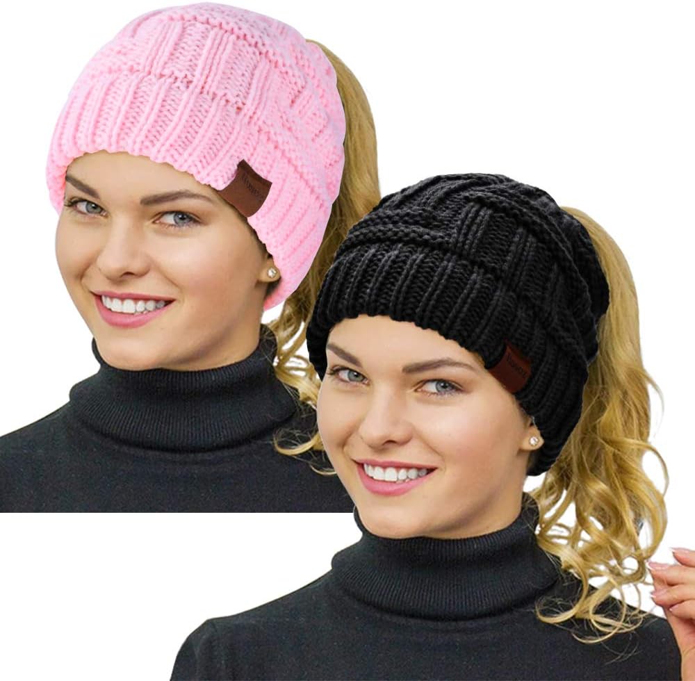 Rosoz Womens Ponytail Beanie Winter Beanie Hat Ponytail Hatfor Women Tail Stretch Cable Knit Cap Messy High Bun Hat