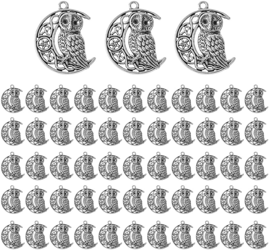 25Pcs Antique Silver Carved Moon Owl Pendant Charms Intricate Design for DIY Jewelry Making for Necklaces Bracelets and Earrings 26 x 33 mm