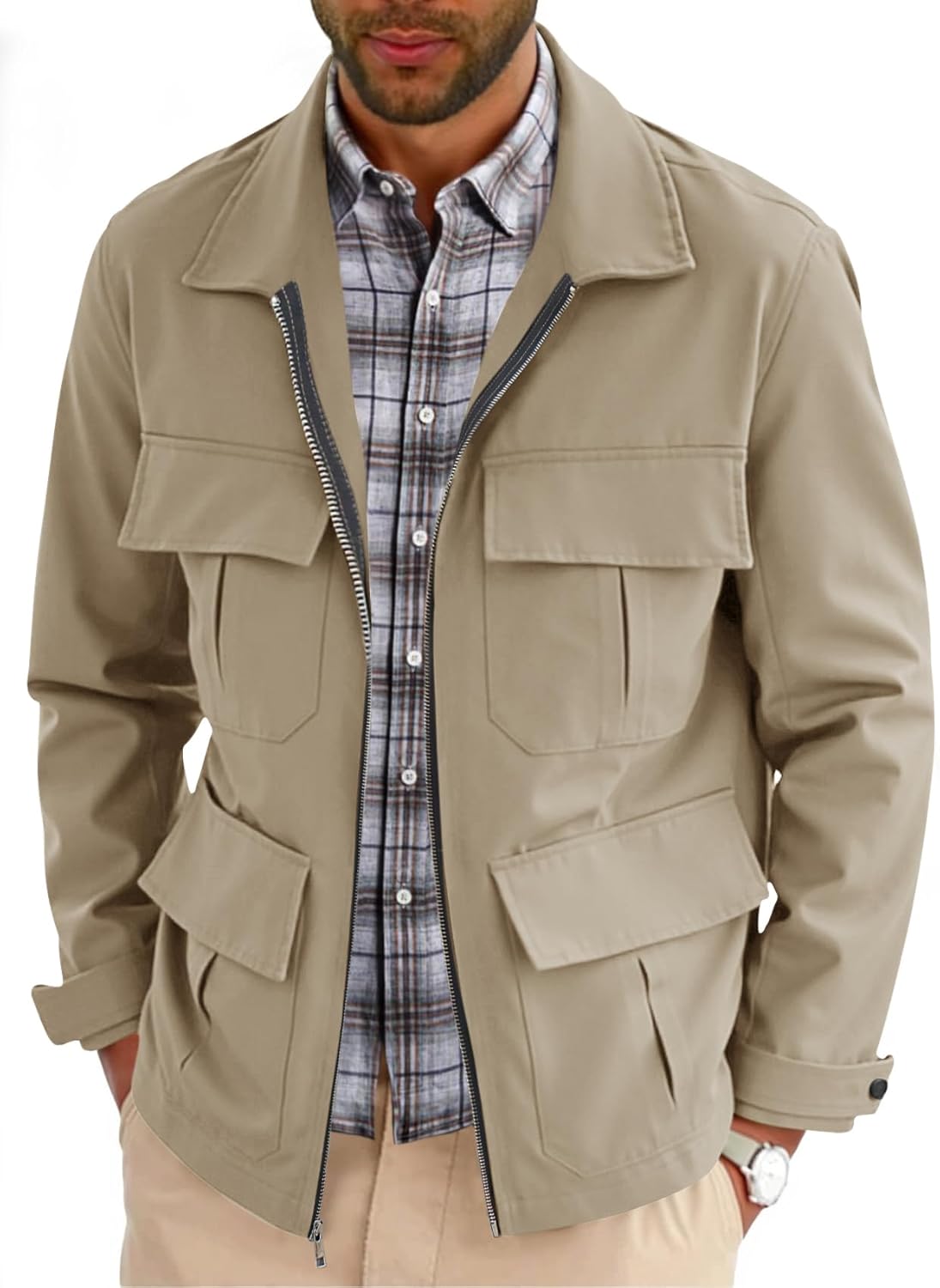 Runcati Mens Safari Jacket Military Full Zip Cargo Jacket Windproof Multi Pocket Outdoor Field Coat
