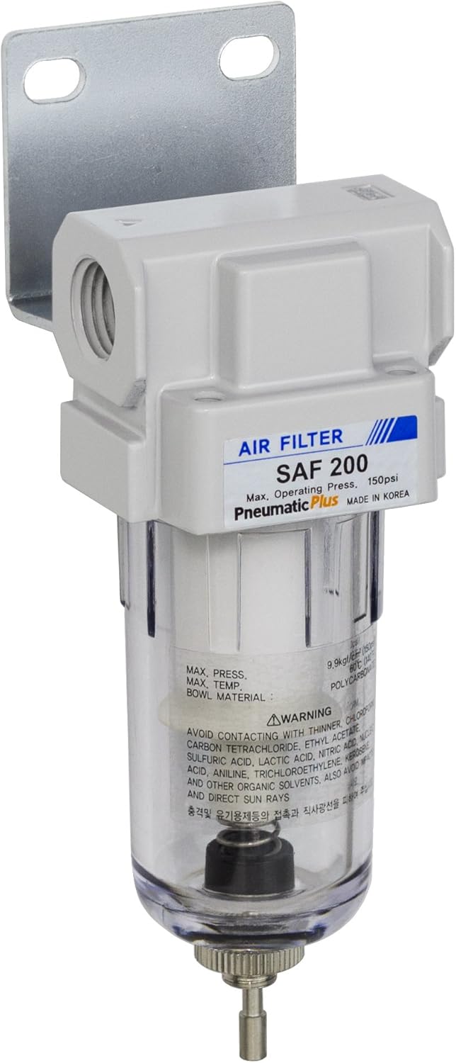 PneumaticPlus SAF200-N02B Miniature Compressed Air Particulate Filter 1/4" NPT - Poly Bowl, Manual Drain, Bracket