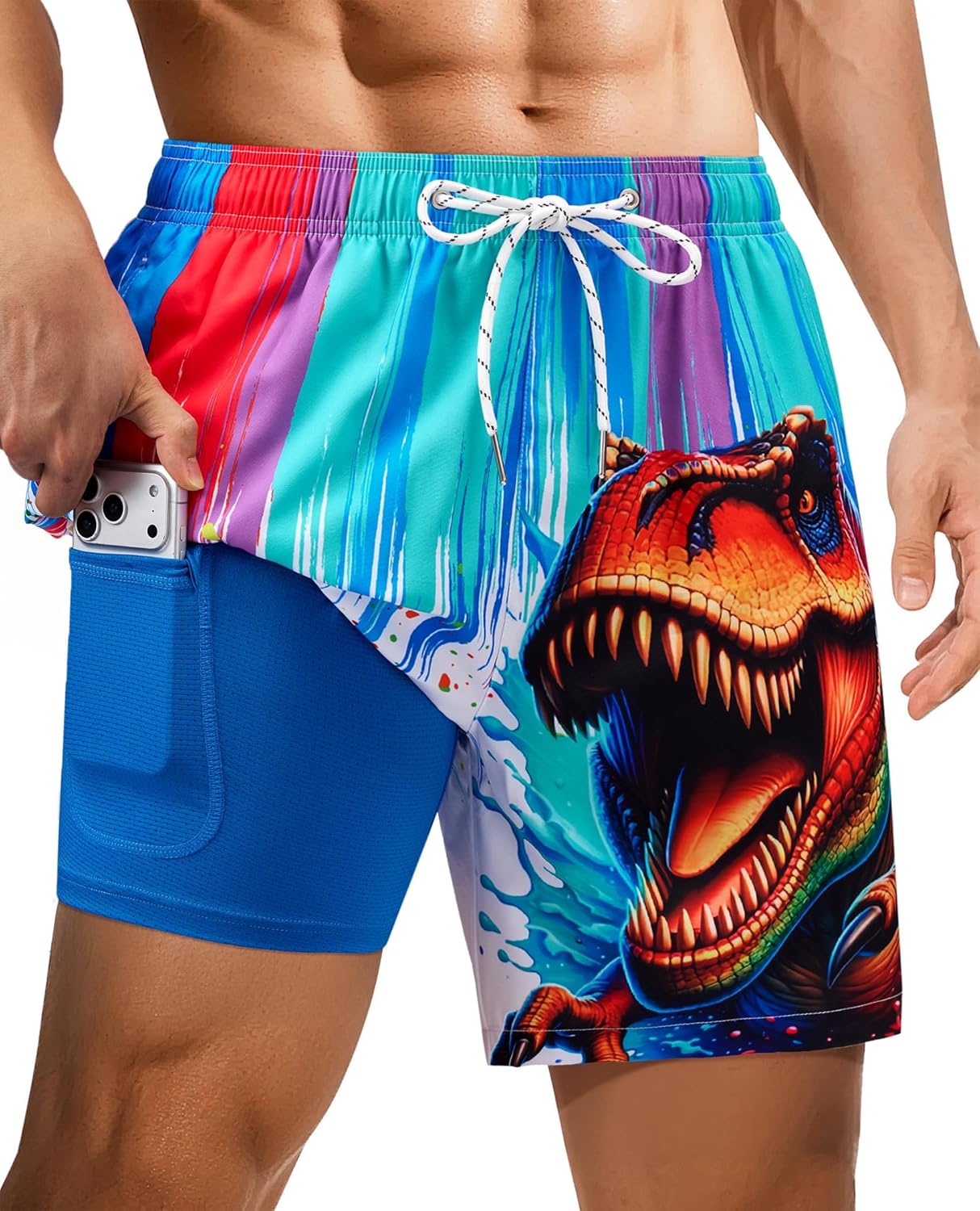 7inch Mens Swim Trunks: with Compression Liner Zipper Pocket Drawstring Quick Dry Stretch Lined 3D FunnyBeach Pool