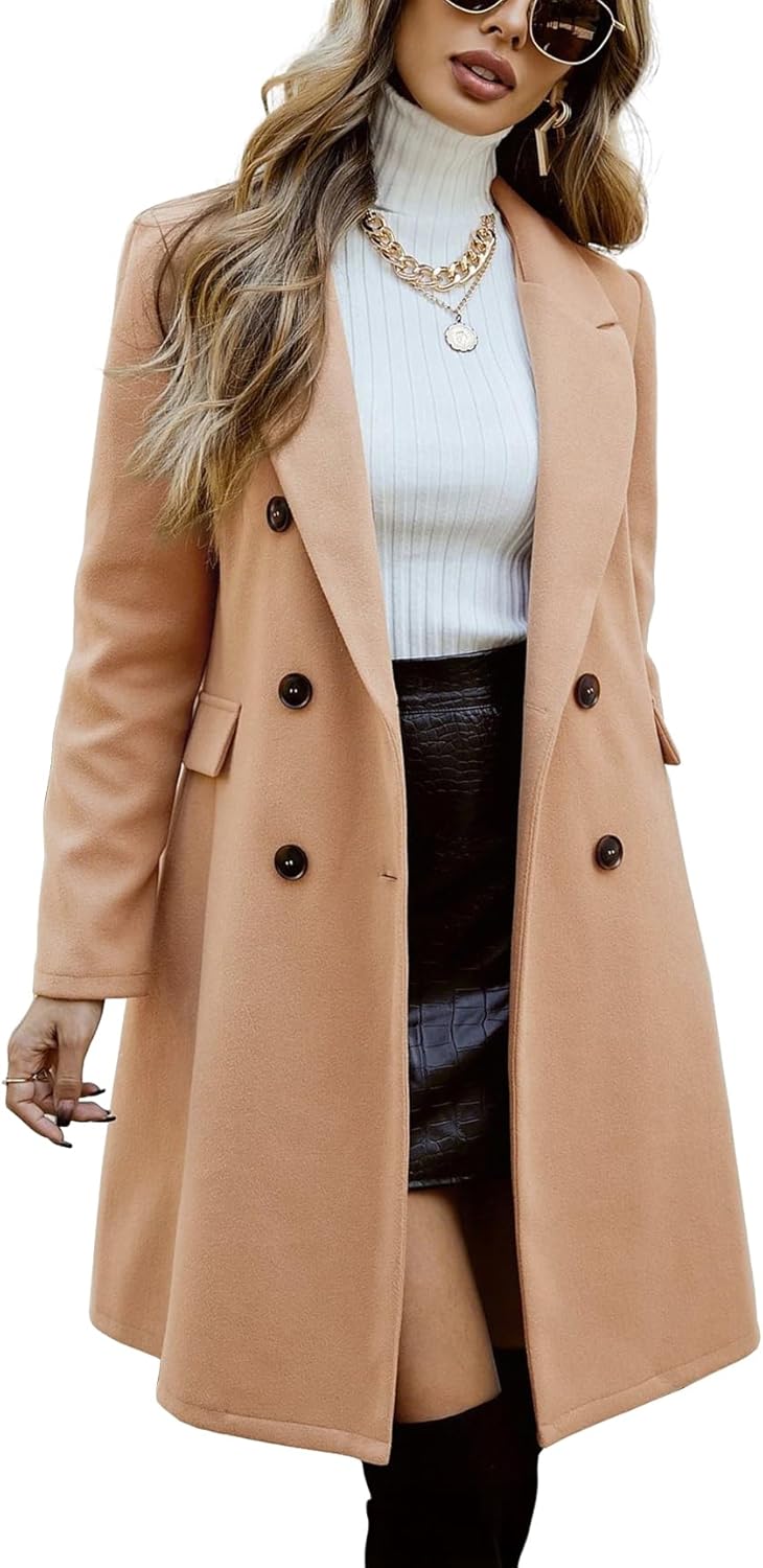 IDEALSANXUN Womens Double Breasted Wool Coat Fall Winter Notch Lapel Trench Coat Peacoat