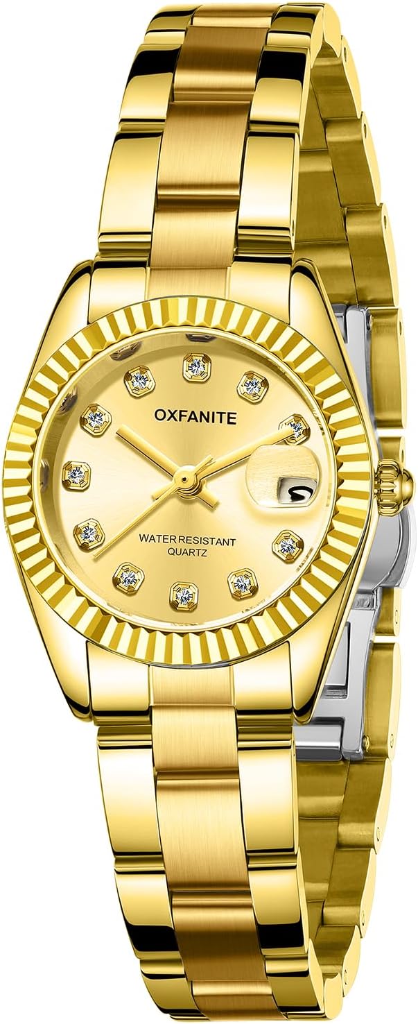 OXFANITE Watches for Women, Fashion Small Gold Analog Quartz Waterproof Stainless Steel Ladies Wrist Watches, with Date Dainty Diamond Luxury Dress Women Watch