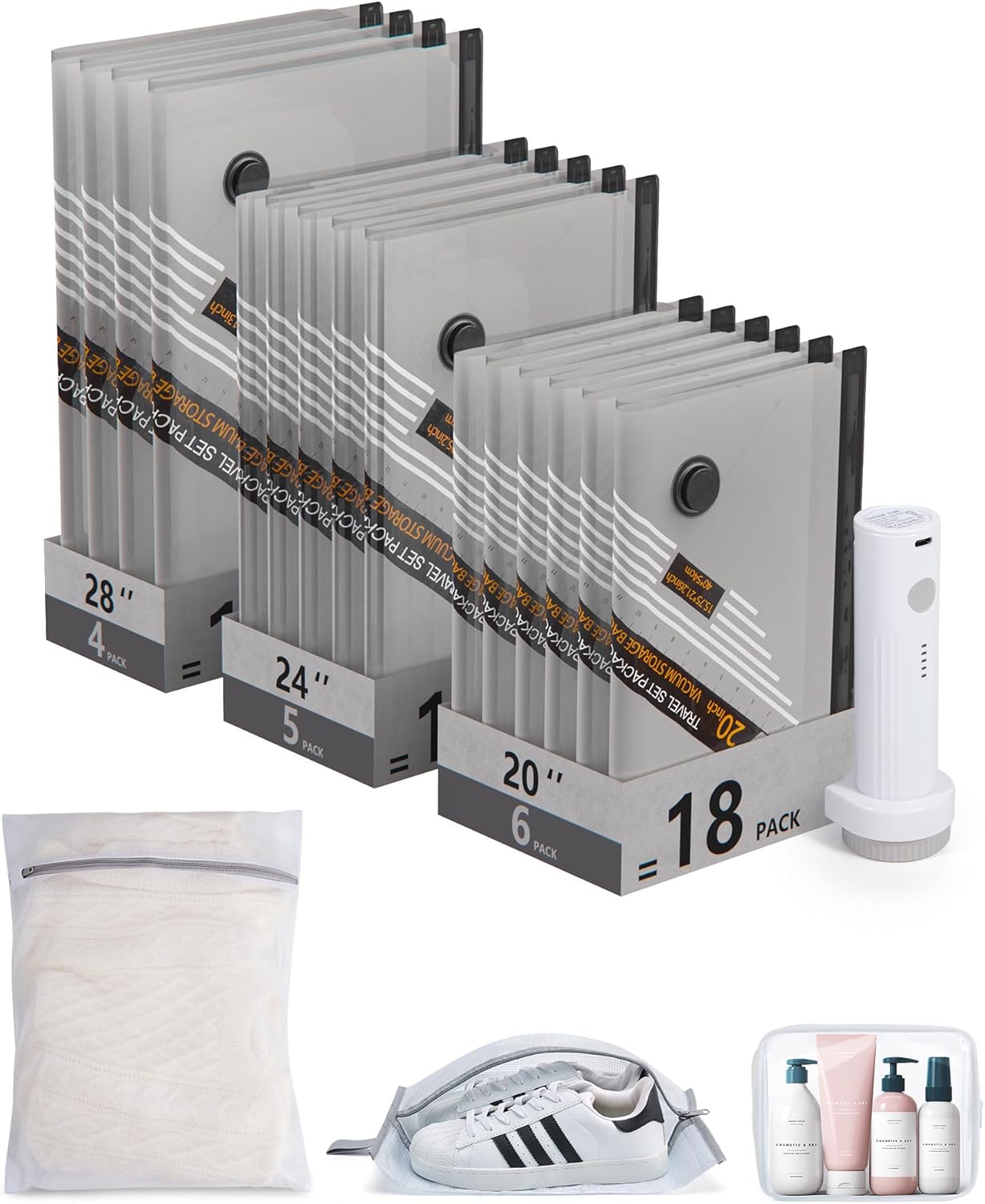 - Complete 18-Piece Travel Set: This kit includes 15 vacuum storage bags in 3 sizes (15.75" x 21.26", 18.5" x 25.2", 21.6" x 29.13"). Stay organized on every trip with the bonus shoe bag, laundry bag, and toiletry bag—your all-in-one packing solution