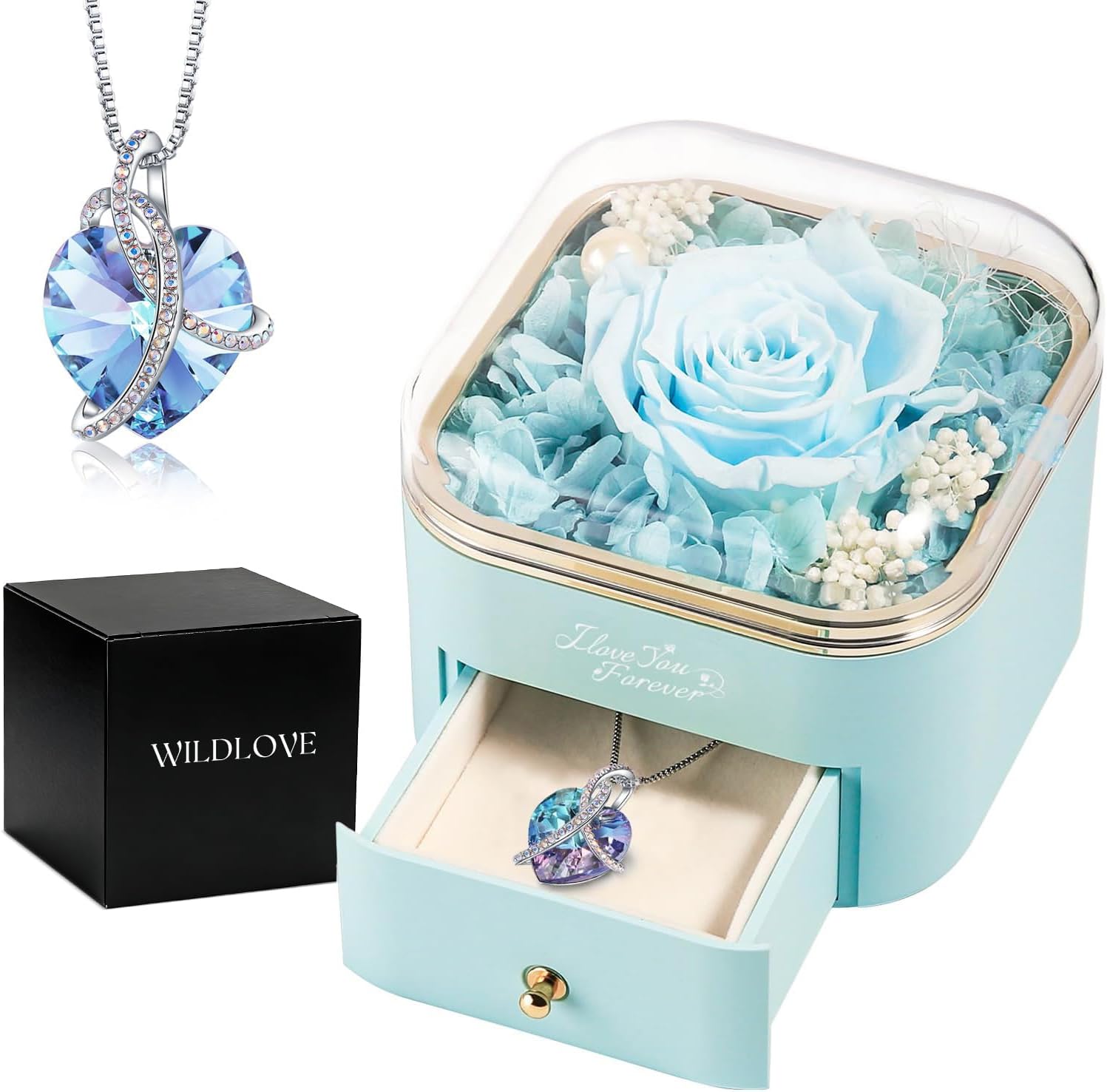 - Preserved Rose with Necklace - WILDLOVE preserved roses crafted from high-quality natural flowers. Unlike other designs, the luxurious rose box has the words "I love you forever" printed on it, and there is a beautiful heart-shaped crystal necklace in the drawer of the rose box, suitable for any women