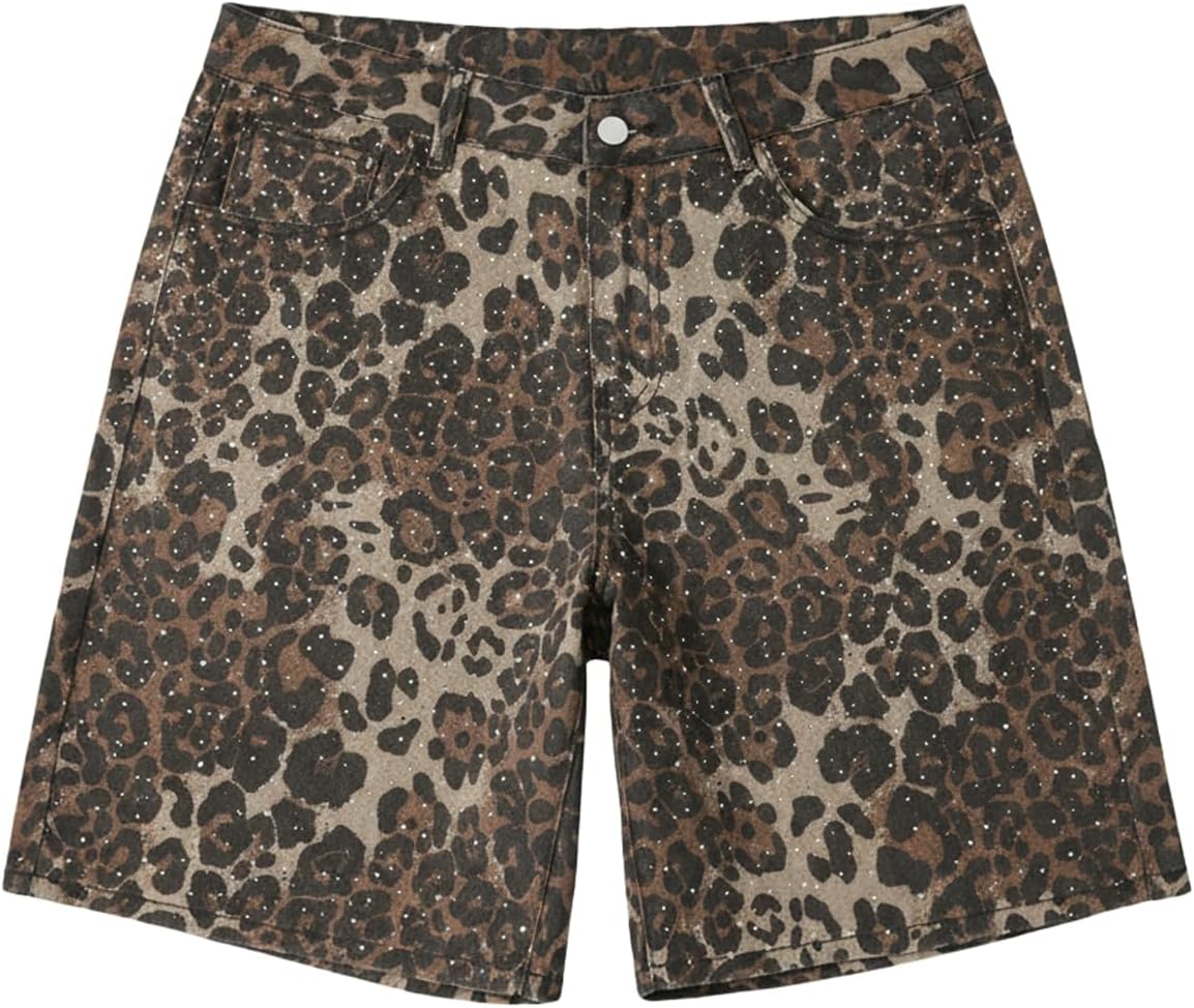 Men's Leopard Rhinestone Baggy Jean Shorts Y2K Cheetah Wide Leg Denim Shorts Streetwear