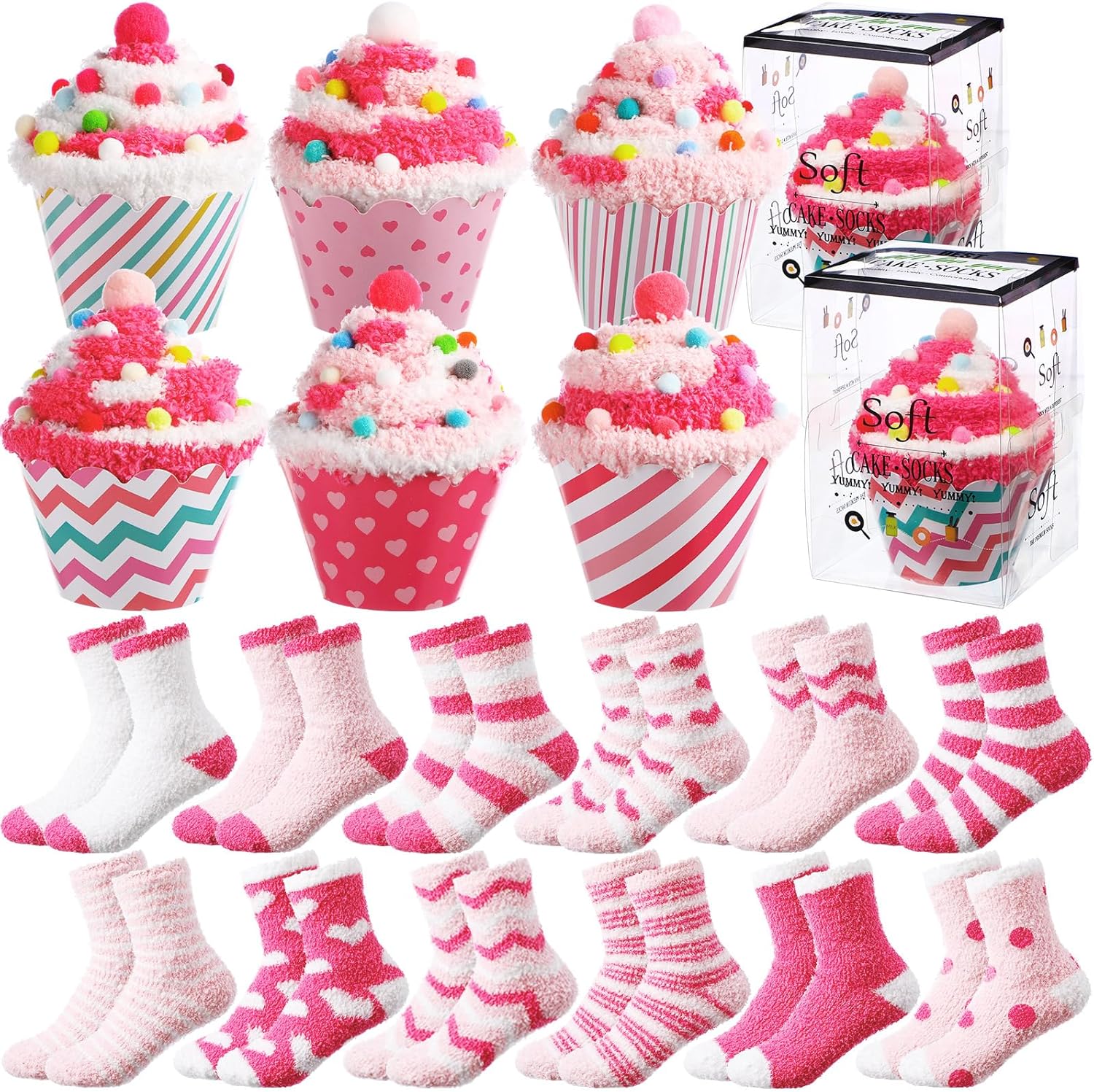 Geyoga 12 Pair Valentine's Day Cupcake Socks Fuzzy Heart Socks Gifts for Women Bulk Fluffy Cozy Slipper Sock DIY