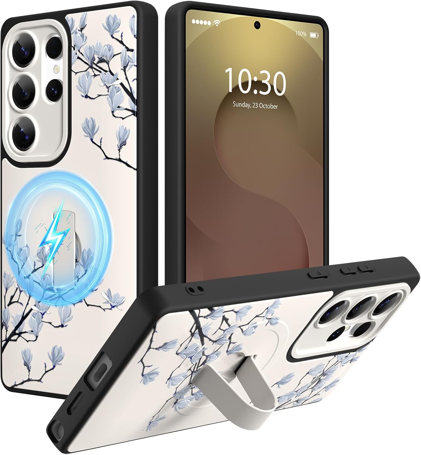 Magnetic Case Compatible with Samsung Galaxy S25 Ultra for Women Men, Cute Flower Floral Pattern, Built in Adjustable Wrist Strap Grip Hand Holder Shockproof Kickstand Cover (White)