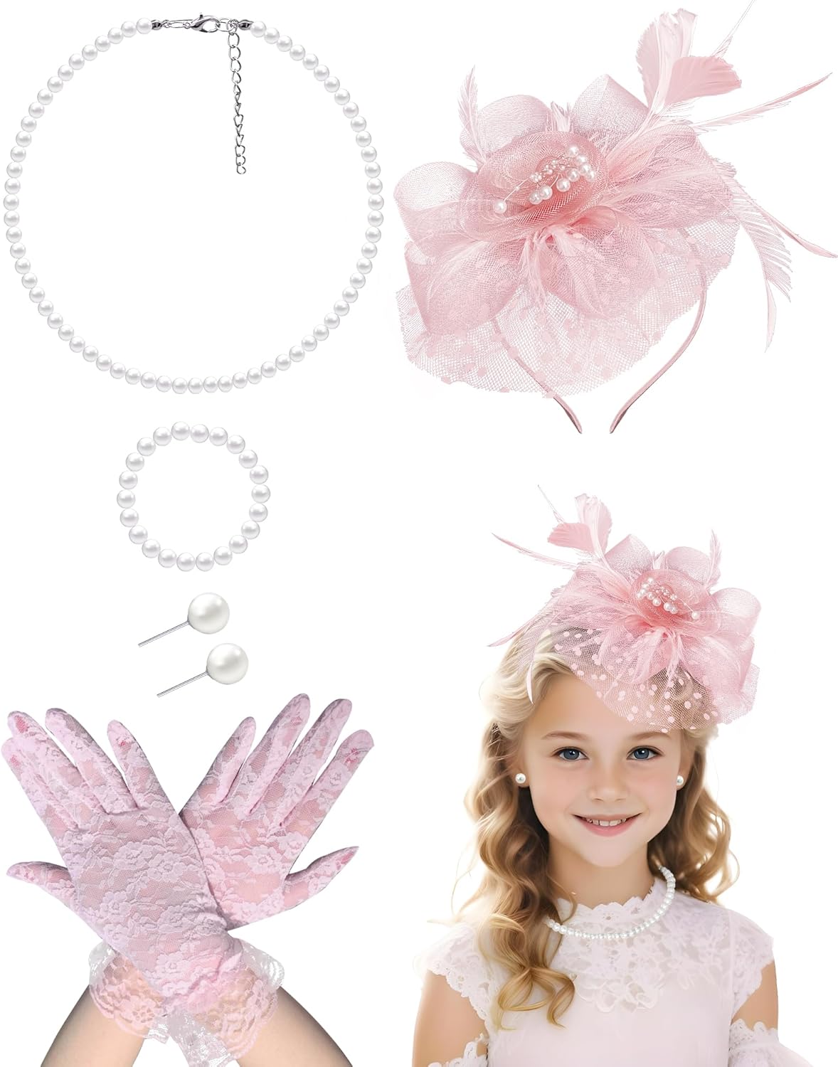 Girls Tea Party Fascinators Hats with Lace Gloves Pearl Necklace Earring Jewelry for Tea Party Wedding Accessories