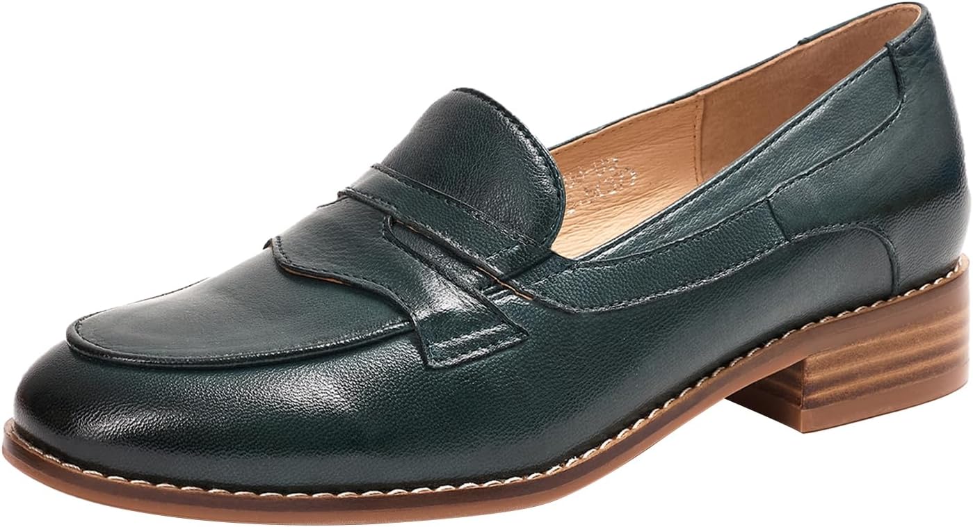 Mona flying Women's Comfort Leather Round Toe Penny Loafers Dress Casual Slip On Flats Ladies Office Work Shoes