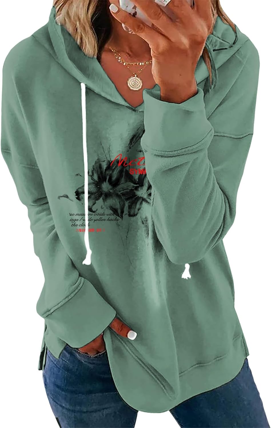 Women's White Floral Print Hoodie Long Sleeve Pullover Sweatshirt Loose Fit Cotton Blend Drawstring Hooded Top