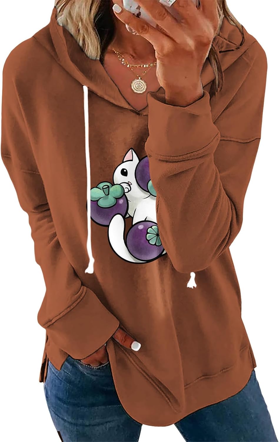 Women's White Floral Print Hoodie Long Sleeve Pullover Sweatshirt Loose Fit Cotton Blend Drawstring Hooded Top