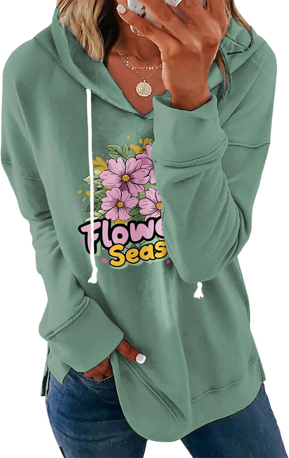 Women's White Floral Print Hoodie Long Sleeve Pullover Sweatshirt Loose Fit Cotton Blend Drawstring Hooded Top