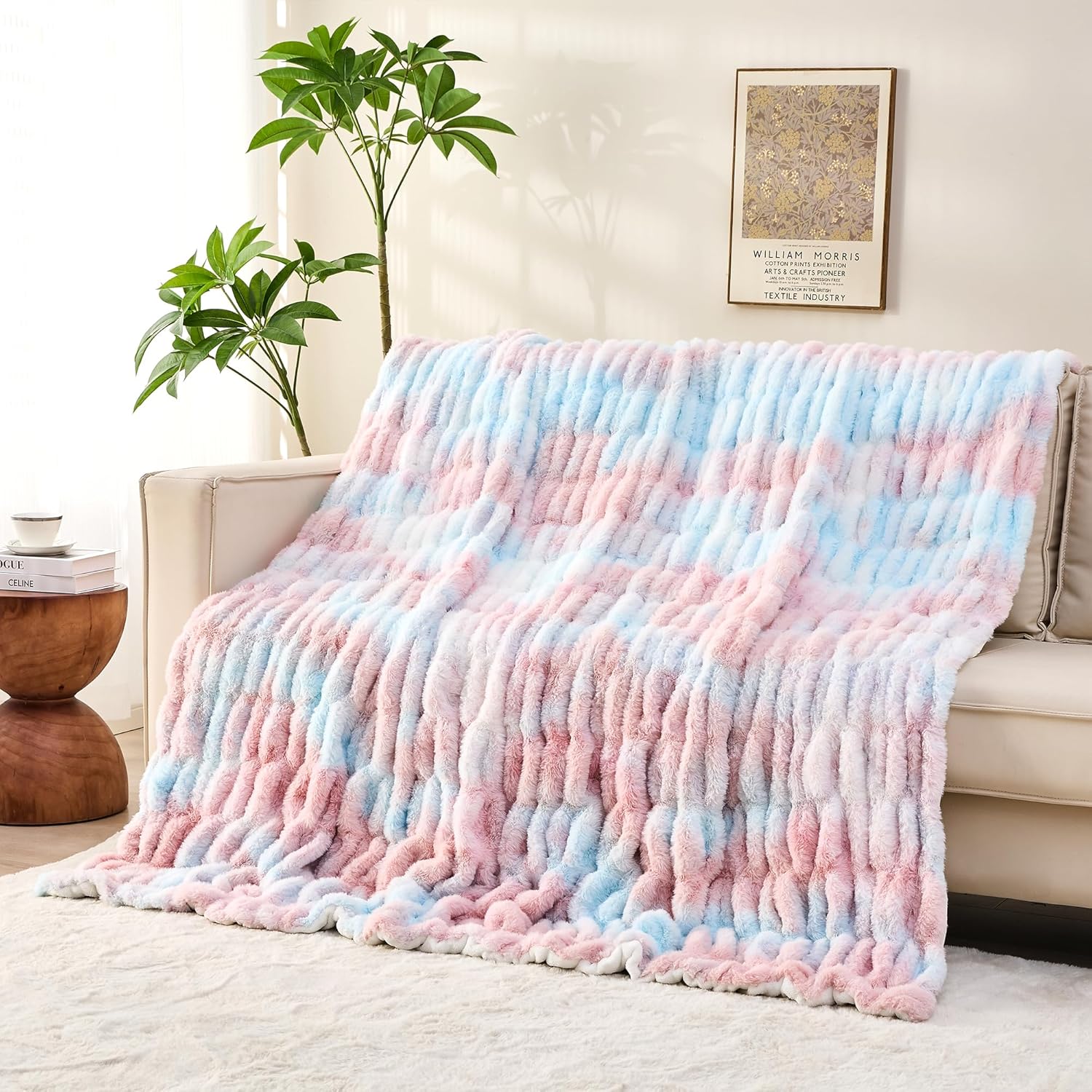 Viviland Faux Fur Throw Blanket for Bed Couch Sofa - Soft Cozy Furry Warm Throw - Comfy Shaggy Blanket - Machine Washable - Pink & Blue Fuzzy Plush Throw - 50"× 60"