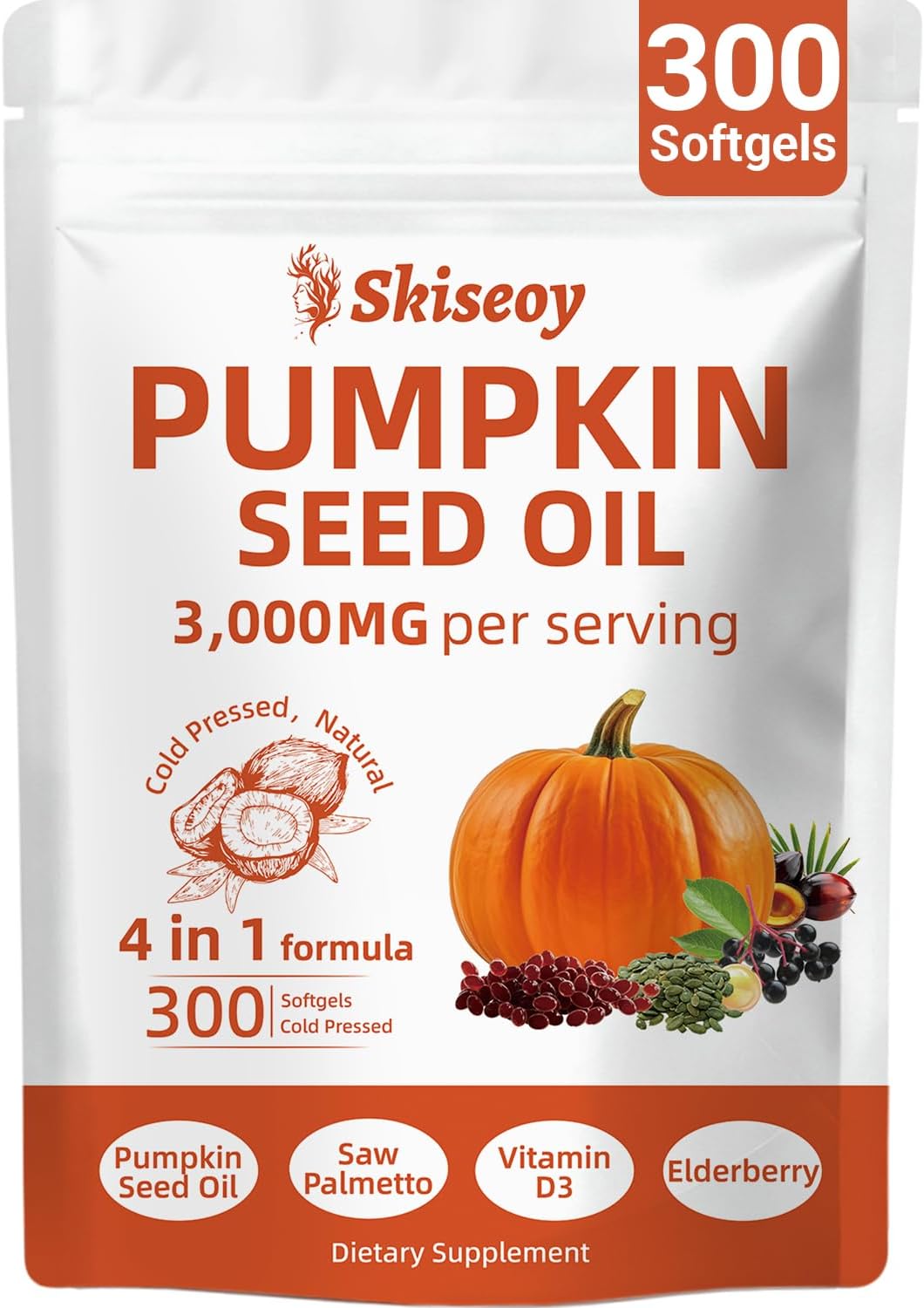- 【4-IN-1 Pumkin Seed Oil Capsules】Skiseoy 4-IN-1 Pumkin Seed Oil capsules contain 300 softgels 3,000mg pumkin seed oil each serving with saw palmetto, elderberry extract, and vitamin D3. This powerful combination helps support immunity and digestive health, contributing to overall wellness and nutrients for daily balance.