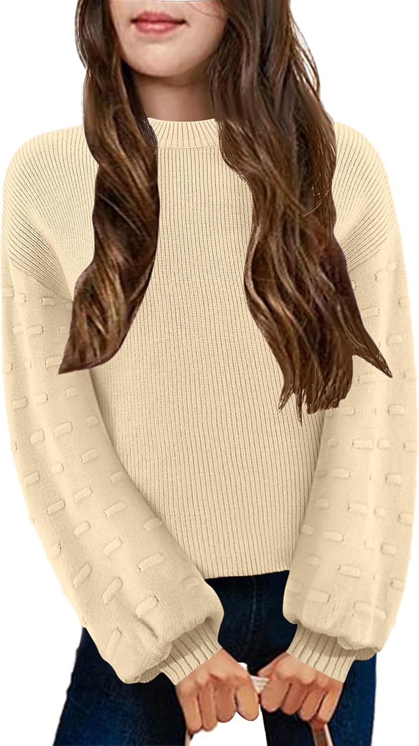 Arshiner Girls Crewneck Sweaters Chunky Lantern Sleeve Knit Jumper Tops Casual Drop Shoulder Pullover Outwear for 5-13 Years