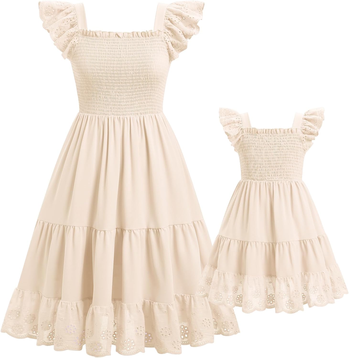 AWIBMK Mommy and Me Dress Boho Summer Casual Holiday Mother Daughter Matching Ruffle Sleeve A-line Tiered Smocked Dress