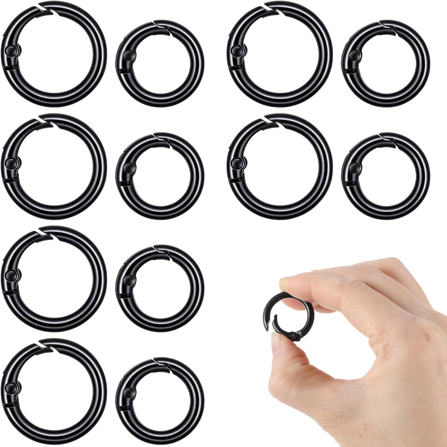 - Material: The small black carabiner is made of zinc alloy with a smooth surface, ensuring a secure hold without scratching or damaging items. The spring O-rings can be used as accessories for your DIY crafts