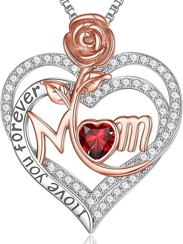 Rose Birthstone Gifts for Mom, S925 Sterling Silver Rose Heart Pendant Birthstone Necklace Mothers Day Valentines Day Christmas Birthday Jewelry Gifts for Mom