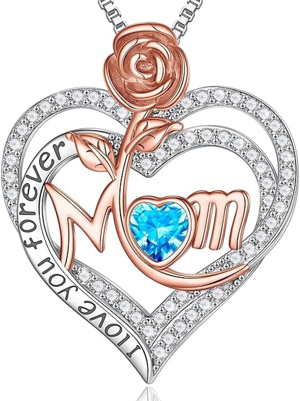 Rose Birthstone Gifts for Mom, S925 Sterling Silver Rose Heart Pendant Birthstone Necklace Mothers Day Valentines Day Christmas Birthday Jewelry Gifts for Mom