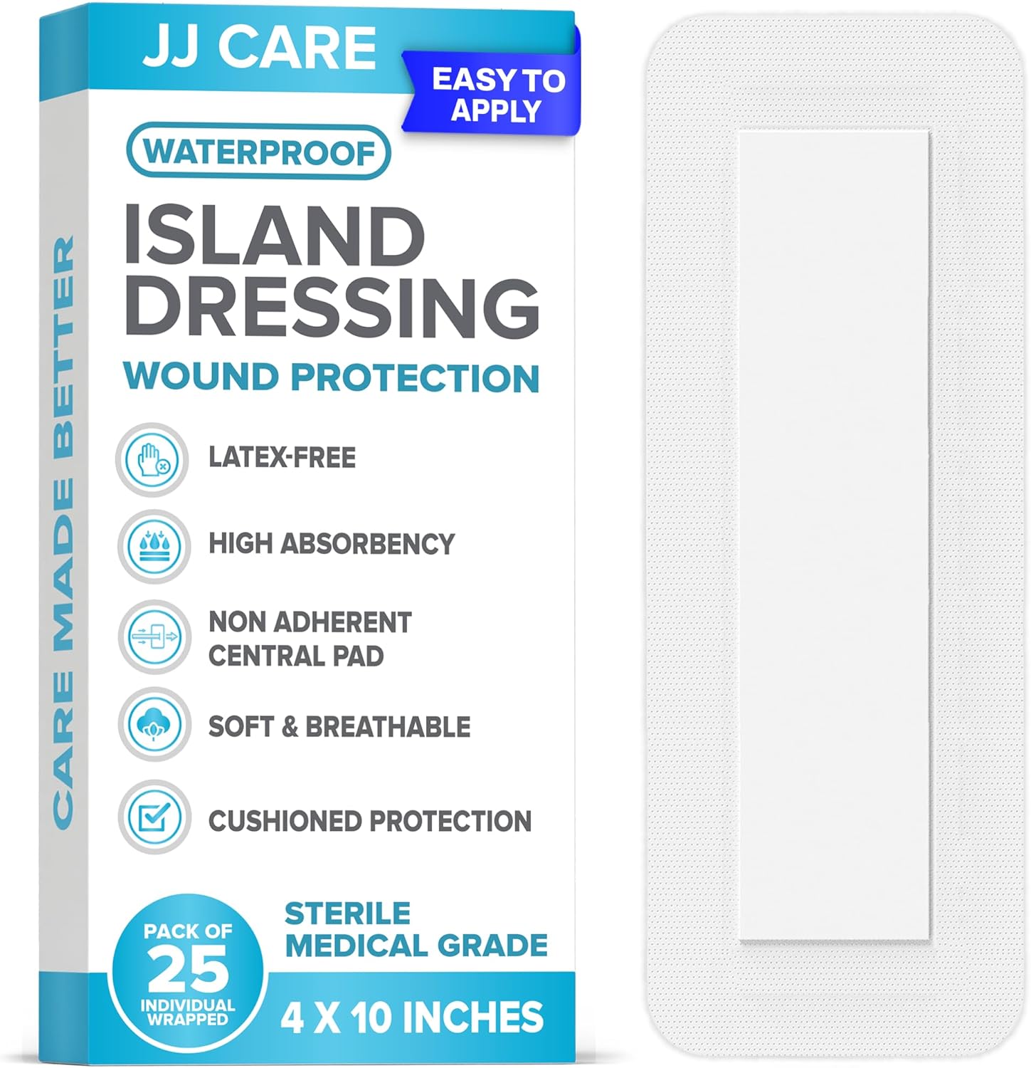 ![JJ CARE Waterproof Adhesive Island Dressing [Pack of 25], 4" x 10" Sterile Bordered Gauze, Breathable Island Wound Dressing, Individually Wrapped Adhesive Gauze Bandages with Non-Stick Central Pad - Image 2](https://m.media-amazon.com/images/I/81anuXZCS5L._AC_SL1500_.jpg)