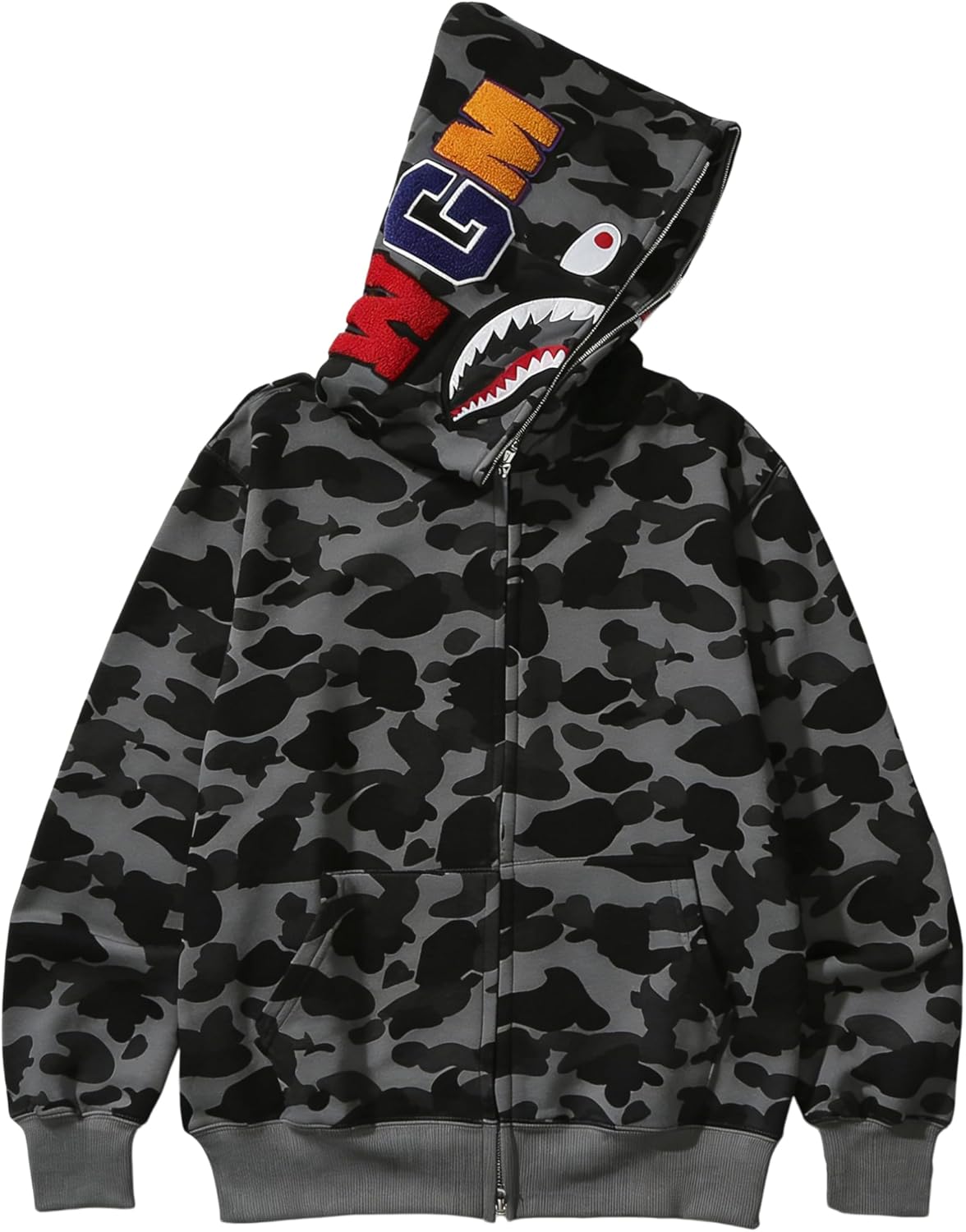 RICK TOP ONE Unisex Camouflage Hoodie with Shark Embroidery, Full Zip, Lightweight Couple sweatshirts heavyweight hoodie