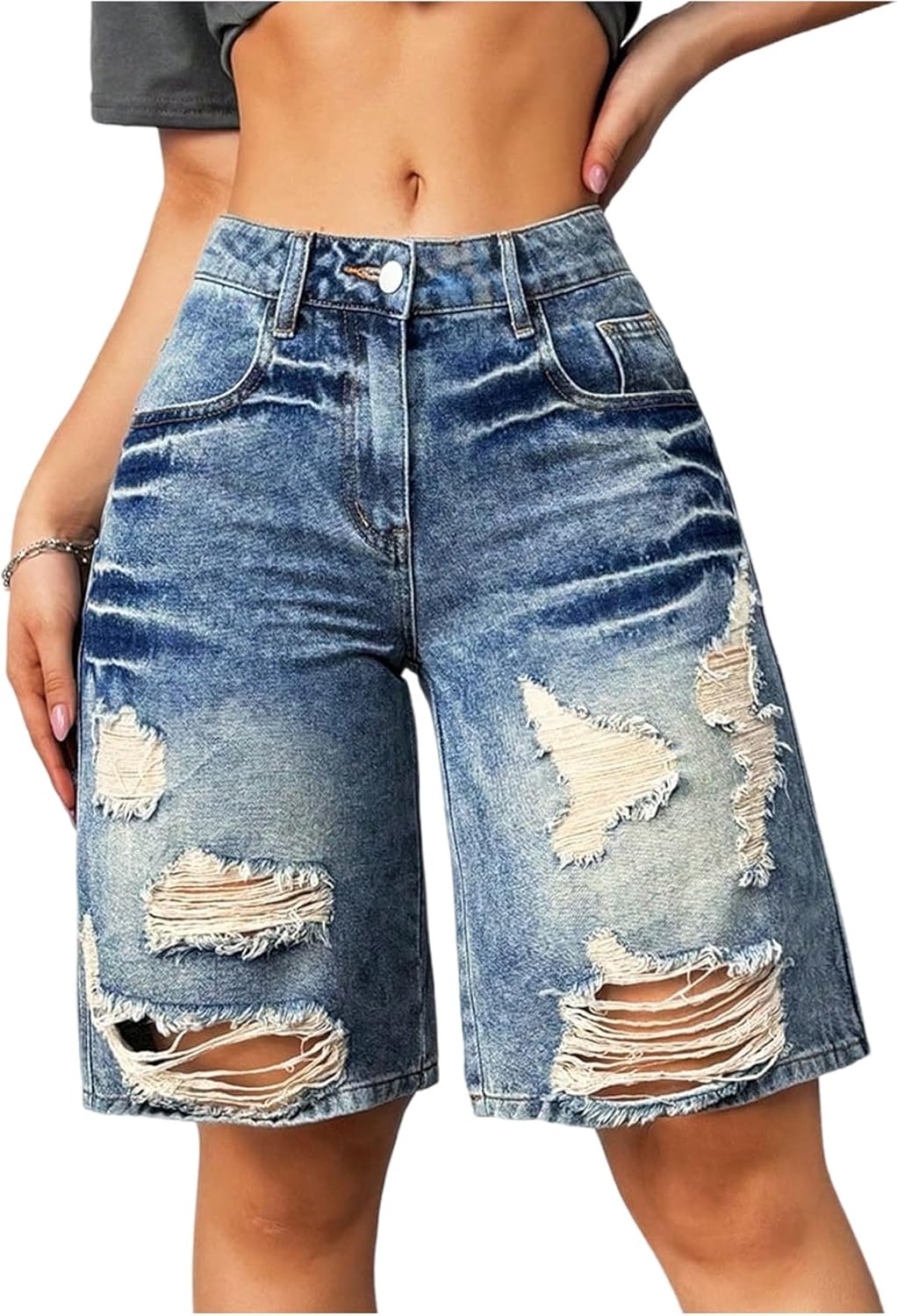 WDIRARA Women's Ripped Raw Hem Bermuda Denim Shorts Mid Rise Distressed Jean Shorts Streetwear
