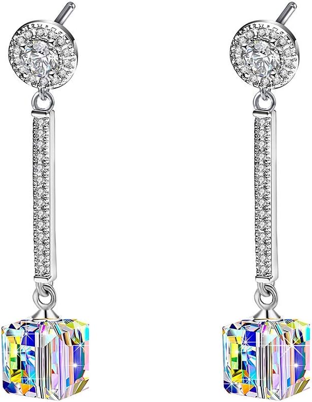 Cube Austrian Crystal Drop Long Dangle Earrings for Women 925 Sterling Silver Post Hypoallergenic Jewelry