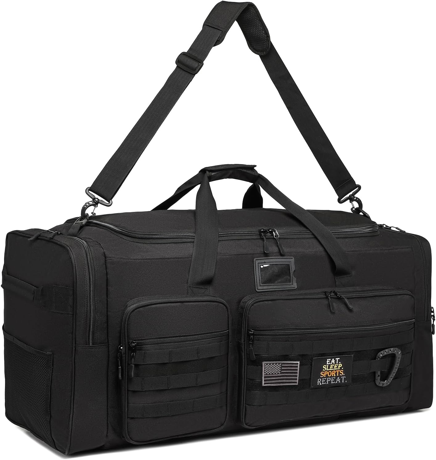 - MOLLE Webbing : This tactical duffle bag includes 2 patches and 1 carabiner. You can also personalise the bag by replacing the patches with different ones according to your preference. Designed with MOLLE webbing on the front, you can hang frequently used accessories or pouches for extra capacity. The removable padded shoulder strap makes it easier on your shoulders so you can go further and enjoy longer activities