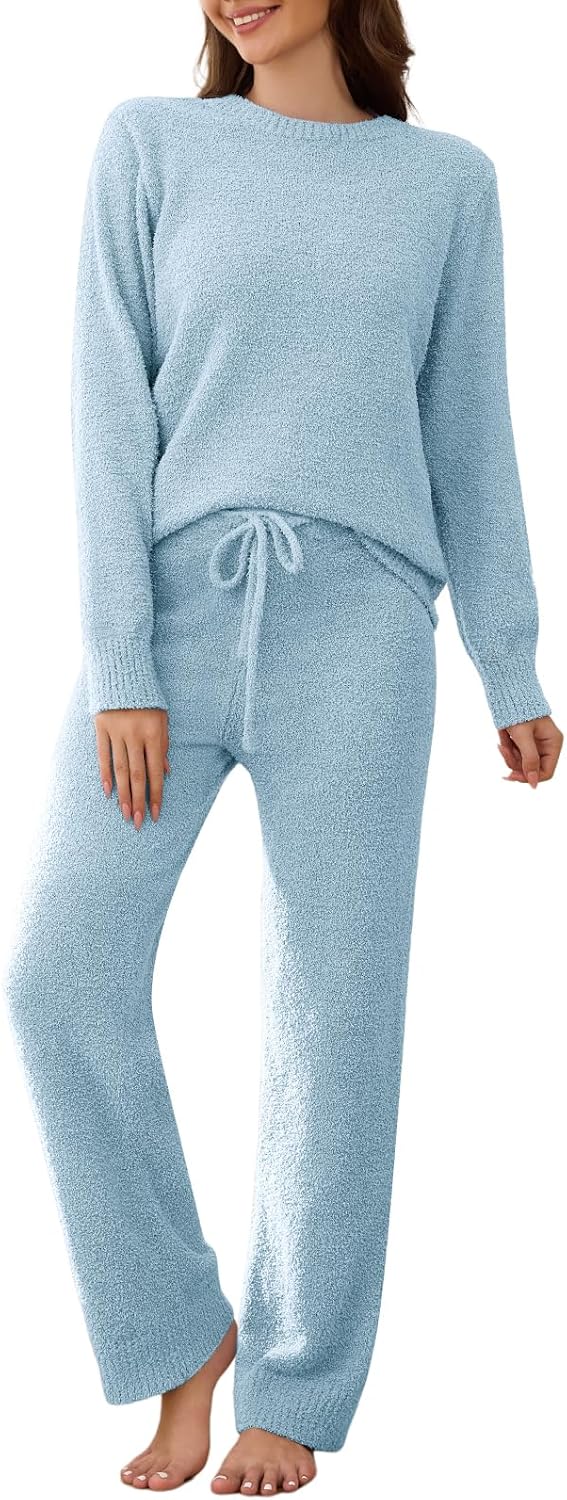Womens Fuzzy Fleece Pajamas Set 2 Piece Cozy Pjs Lounge Set Warm Long Sleeve Knit Pullover Sweater Pants Loungewear