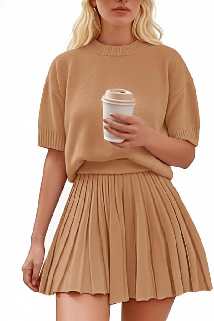 Womens 2 Piece Outfits 2026 Short Sleeve Crewneck Knit Tops And Pleated Mini Skirt Two Piece Sets