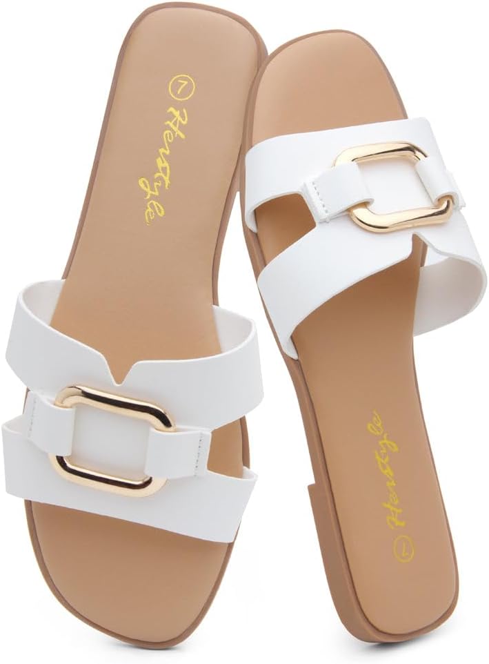 Herstyle Women’s Flat Sandals 2025 – Square Open Toe Fashion Casual Slides with Metal Chain, Memory Foam Footbed Insole, Slip-On Dressy Sandals for Summer