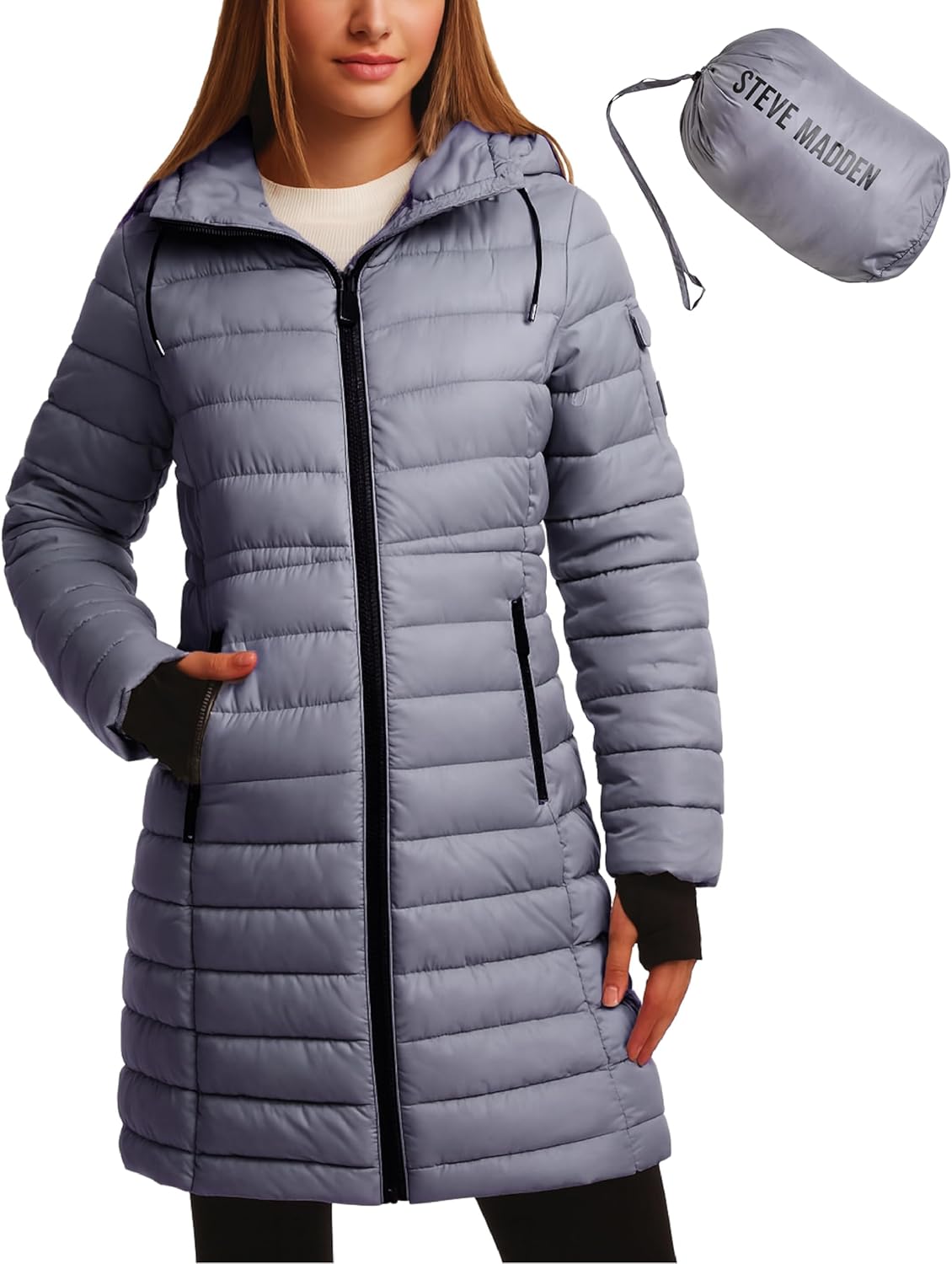 Steve Madden Womens Packable Puffer Jacket - Insulated Puffer Hooded Long Parka Coat - Quilted Warm Winter Jackets for Women