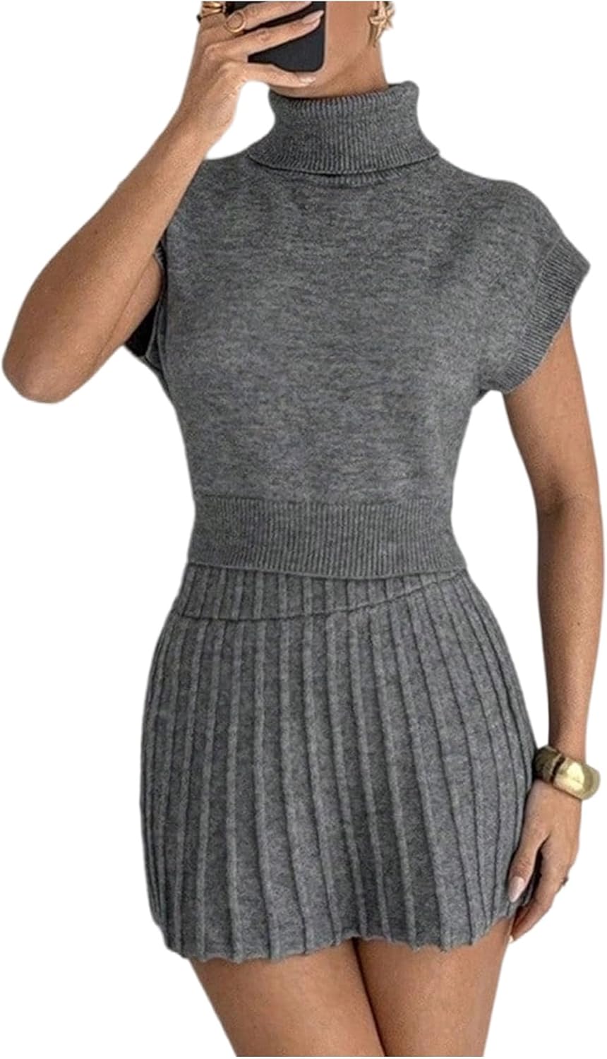 WDIRARA Women's Knitted 2 Piece Skirt Outfits Turtleneck Cap Sleeve Sweater Mini Skirt Set