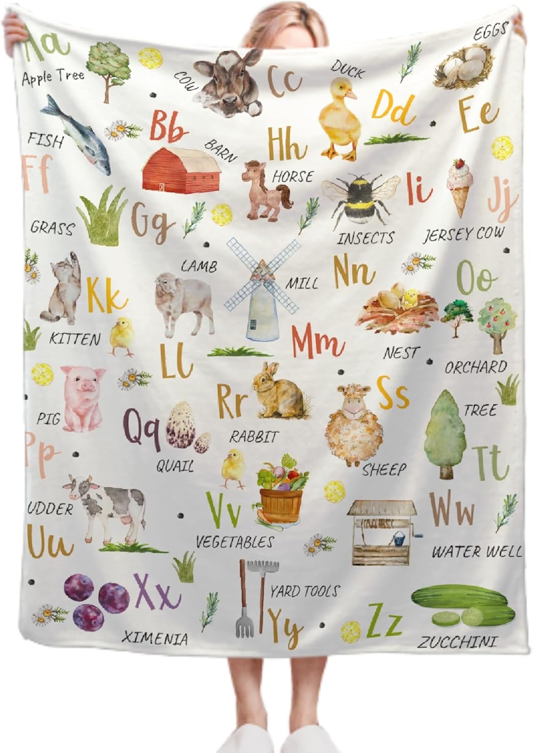 Farm Animals Blanket Cute Alphabet Blanket Alphabet Learning Gift for Kids Girls Boys Super Soft Flannel Throw Blanket for Sofa Couch Camping Travel Warm Cozy Bed Home Decor,40"x50"for Kids/Baby