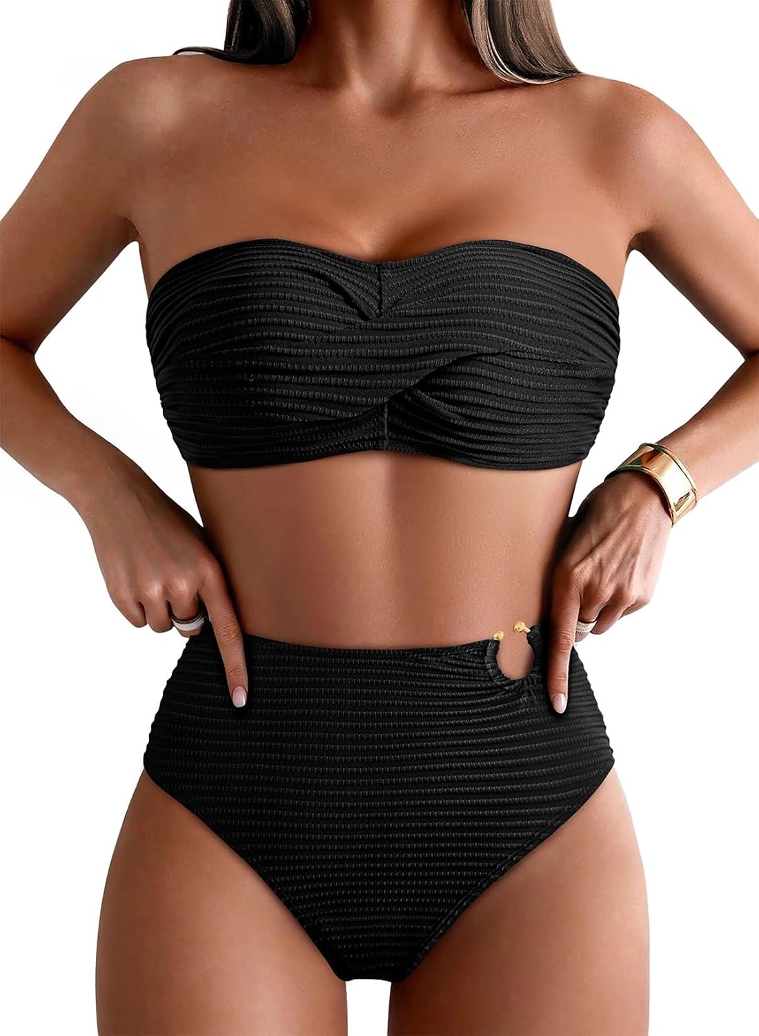 Pink Queen High Waisted Bikini Sets for Women Twist Front Bandeau Top Metal Ring Swimsuits Bathing Suit