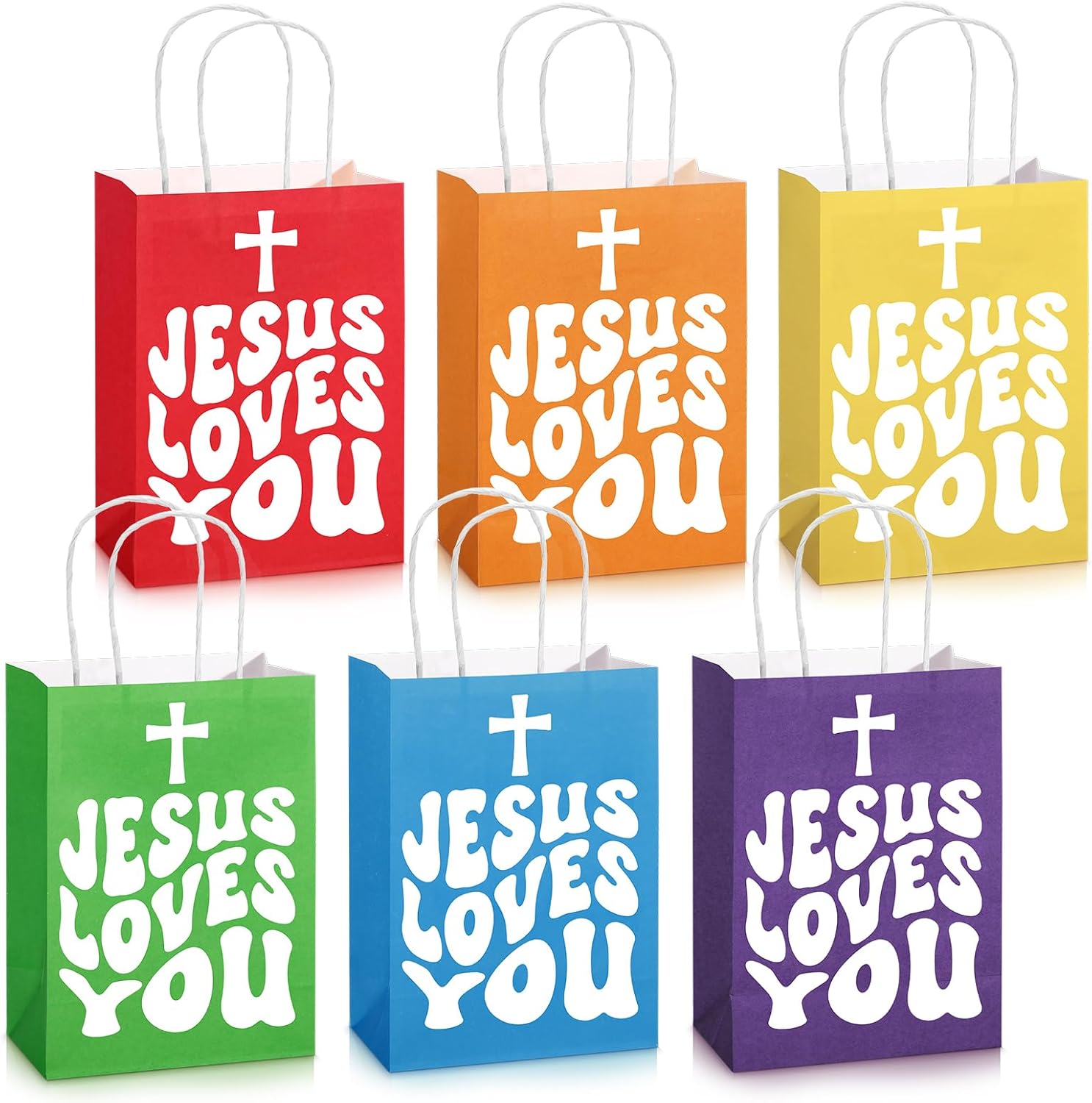 Kolldenn 24 Sets Christian Gift Bulk Jesus Loves You Paper Bag 6 Colors Religious Bible Verse Treat Bag with Handles Inspirational Sunday School Gift for VBS 2025 Church Party First Communion Baptism