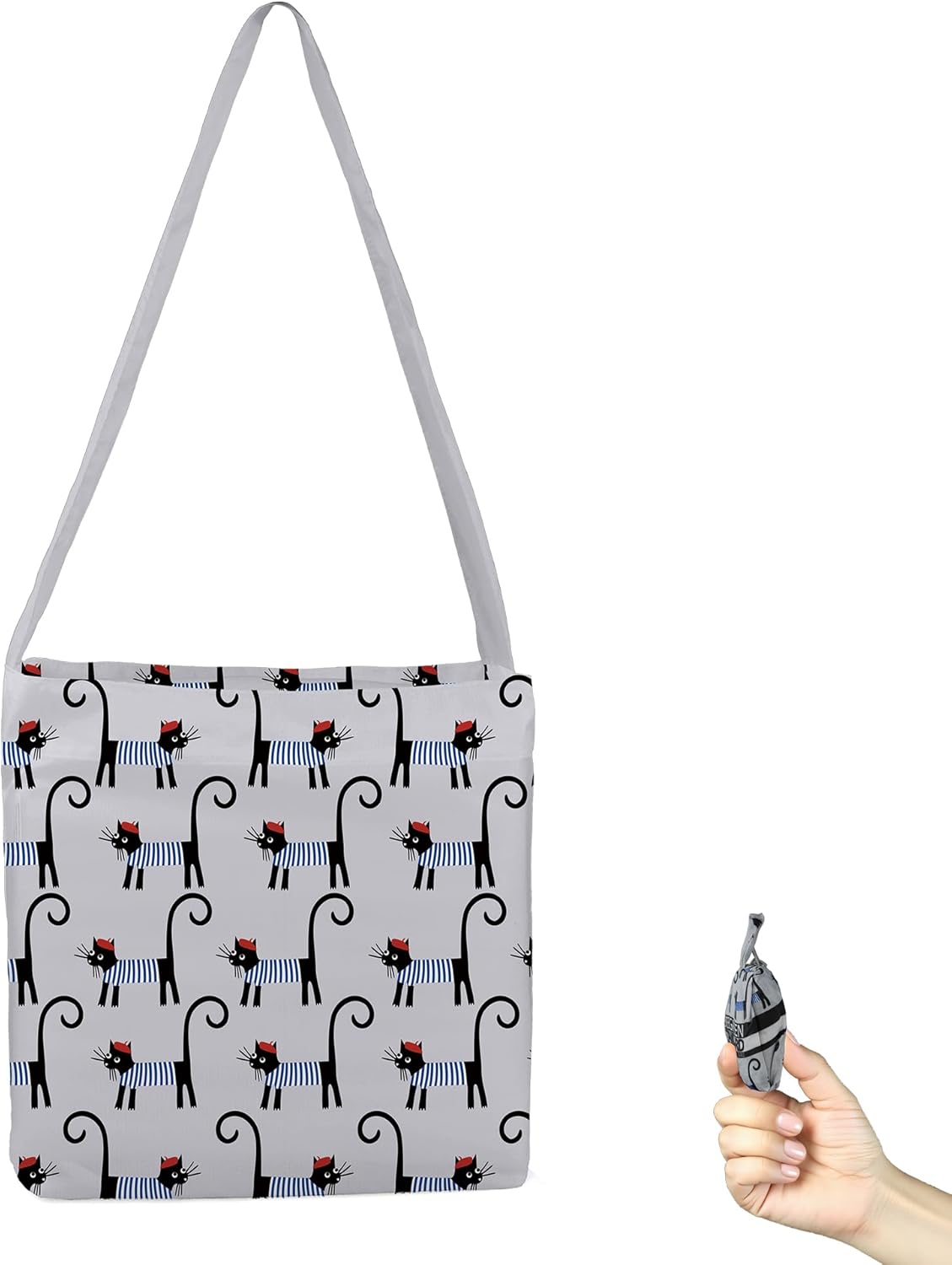 BeeGreen Black and Grey Cat Ultimate Crossbody Tote Bag - Reusable Grocery Shopping Bag - Foldable Compact Portable Sturdy Bags